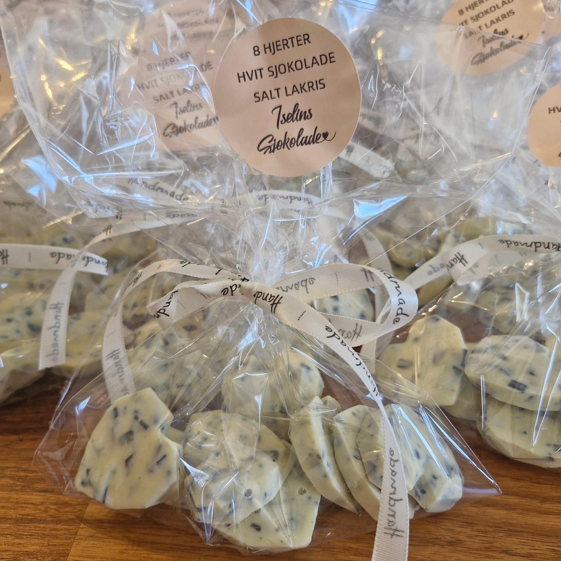 8 stk sjokoladehjerter hvit sjokolade 26,5%, med salt lakris flak.