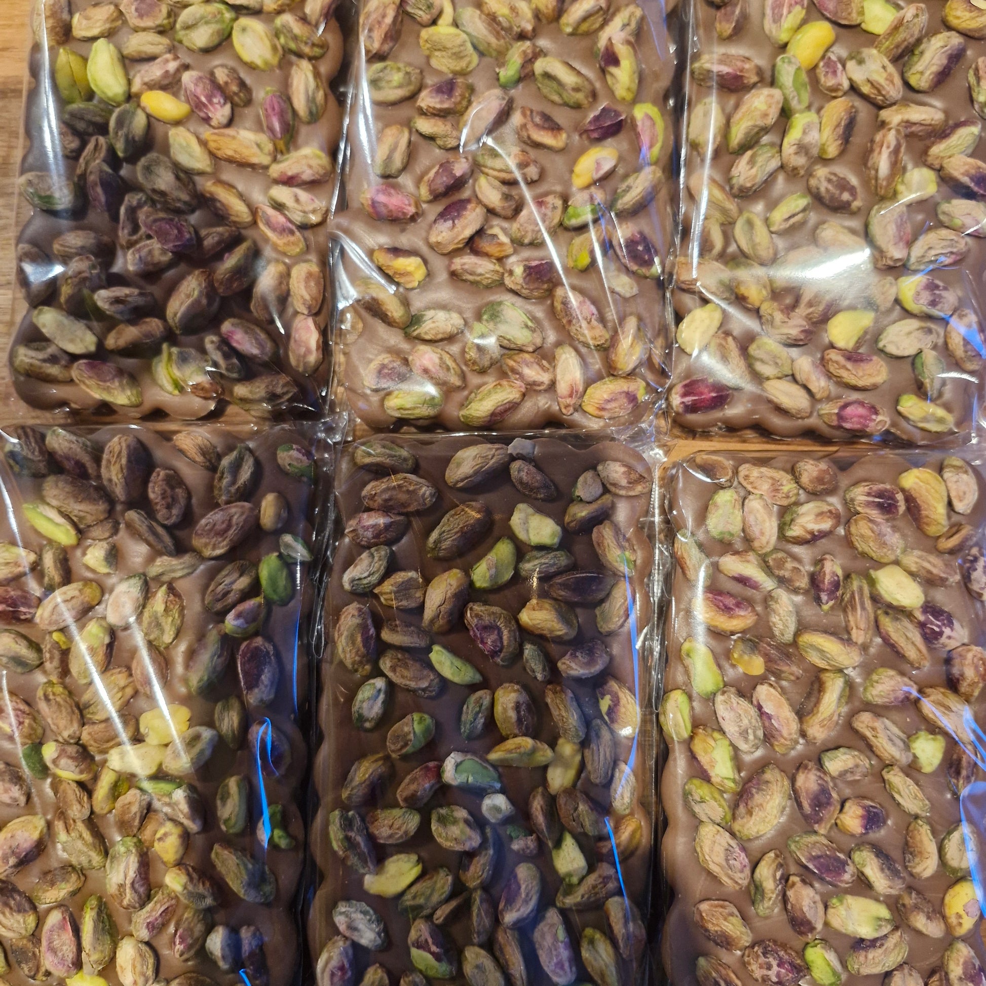 1 stk sjokoladeplate - lys sjokolade 36,5% med pistasjnøtter.